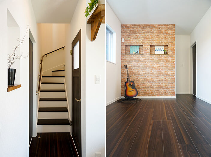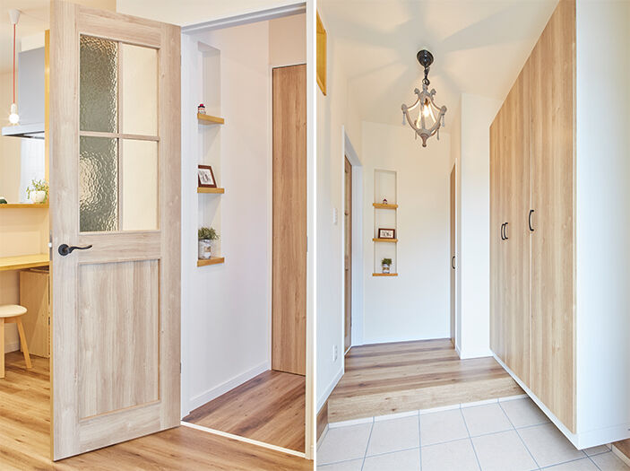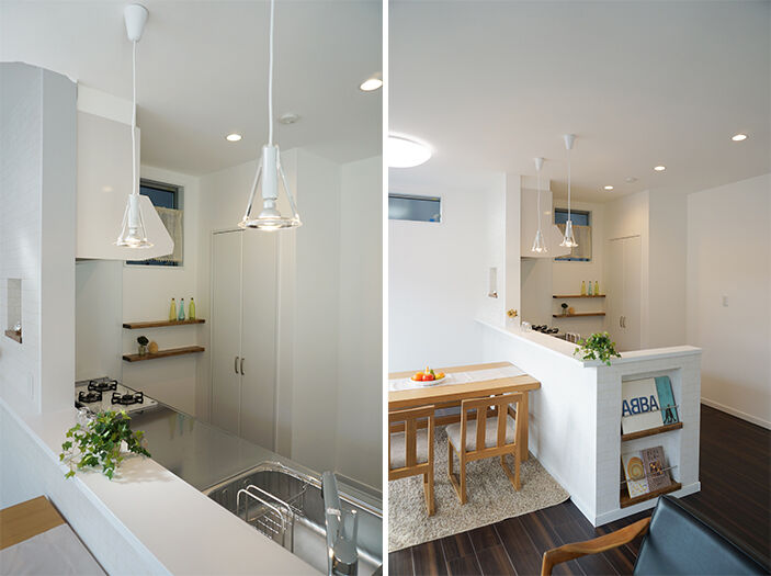 対面式キッチンの周りには、造作の棚やニッチ、カウンターなど便利な工夫も取り入れています。造作のニッチは、サイズ・デザイン・機能により様々に対応でき、暮らしの楽しみが広がります。